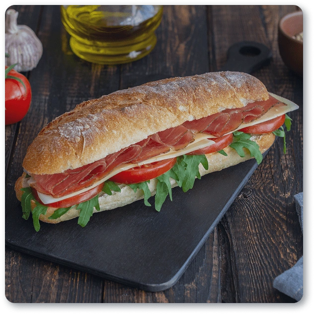 Toplo pecivo punjeno pršutom i sirom, uz salatu i naš umak za ukusan zalogaj.